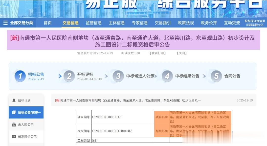 招标网的信息,南通第一人民医院南侧地块,即将开始设计招标。