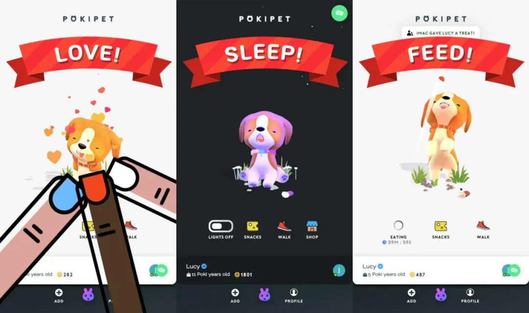 Pokipet将自己定义为“社交宠物游戏”,这里面涉及两个关键词,社交和游戏。