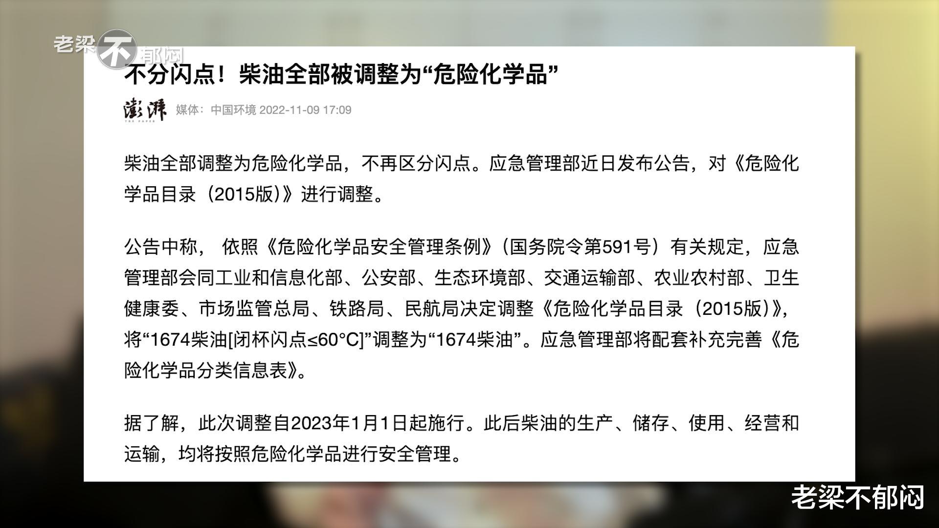 实际上在2023年1月开始,柴油就被全部列入危险品,所以目前对于运输柴油需要相应的资质和车辆是没有争议的。