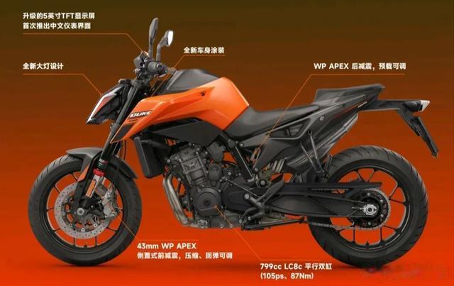 新款790Duke还是搭载那台799cc 直列双缸DOHC每缸四气门水冷LC8c发动机,缸径行程88/65.7mm,压缩比非常高为12.8:1。新款的也没再调校,最大功率依旧是77kW/9000rmp的,峰值扭矩87N.m/8000rmp,折合马力104.7Ps,极速230km/h+,动力性能非常强劲。