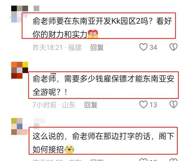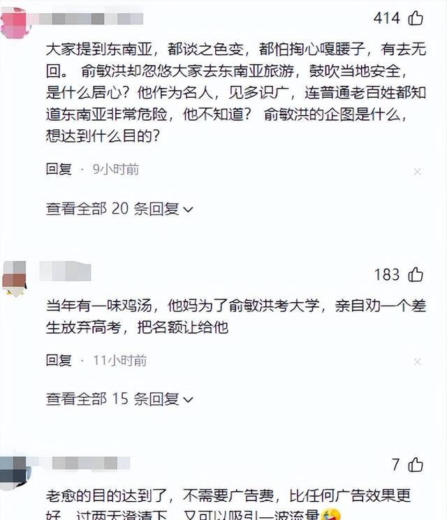 “俞敏洪,你是不是想钱想疯了?这时候还鼓动大家去东南亚旅游,电诈园区有你股份吗?” 一位网友言辞激烈地评论道。
