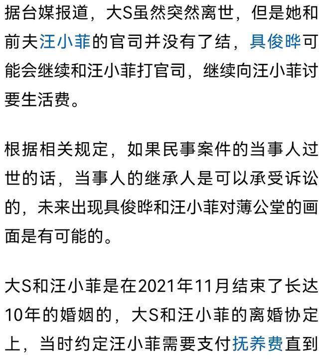 现在啊,具俊晔和汪小菲之间就像两座即将碰撞的冰山,随时可能有激烈的碰撞。据媒体报道,大S和汪小菲的离婚官司还没有结束呢。就在这个节骨眼儿上,具俊晔可是有着不小的权力哦。他不仅可以继承大S的遗产,甚至可以凭借大S丈夫的身份替大S与汪小菲对簿公堂。这就好比一场复杂的棋局,三个人都被卷入了这场利益和情感的纠葛之中。我有时候在想,如果真的出现这个局面,那将是一个多么混乱的场景啊。也许不久之后,我们就能看到这样一个奇怪的对峙画面:在法庭上,具俊晔和汪小菲面对面,为了大S的事情争得面红耳赤。我都不知道大S的家人还会不会认可女婿具俊晔。这真的是一个充满悬念的故事,就像一部冗长的悬疑剧,每个情节都扣人心弦,大家都在猜测下一步会发生什么。