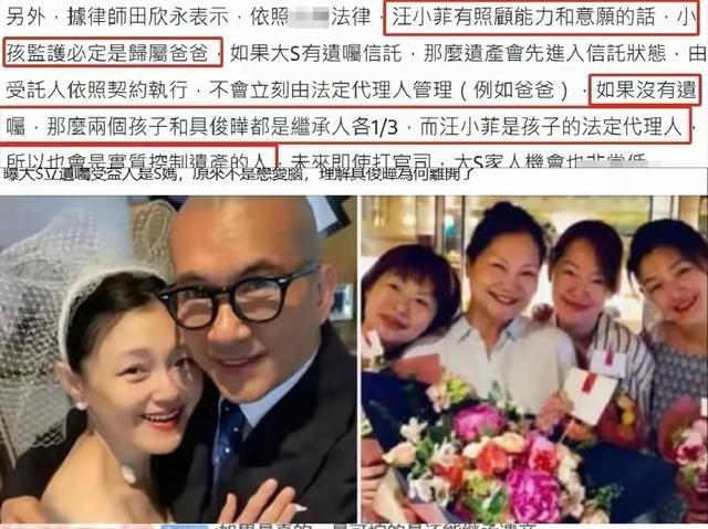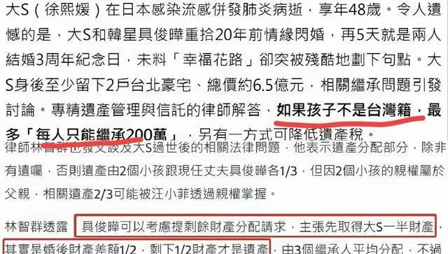更让人大跌眼镜的是,有消息爆料大S离世可能会成为遗产争夺的导火索。要知道啊,台湾媒体之前报道的时候,大S可是留下了巨额的遗产啊。就光房产那一项,就已经达到了6.5亿。这可不是个小数目,就像是一座巨大的金山横在了众人面前。而台湾的律师也出来解读了,按照相关规定,具俊晔作为大S的丈夫,和那两个孩子一样,都属于第一继承人。更有甚者,有的律师还说啊,如果大S的一对儿女不是台湾省籍的话,那可就很不公平了,很有可能一人只能分到200万,剩下的大部分那可能就都是具俊晔的了。这简直就是一个重磅炸弹,我觉得这真的很令人震惊啊。如果事情真的如此,那么这背后的利益纠葛肯定复杂得像一团乱麻。要想改变这种可能的不公平局面,就看大S生前有没有立下遗嘱或者是否进行过婚前财产公证了。这就像是一场看不见硝烟的战争,遗产就像诱饵,吸引着各方势力。