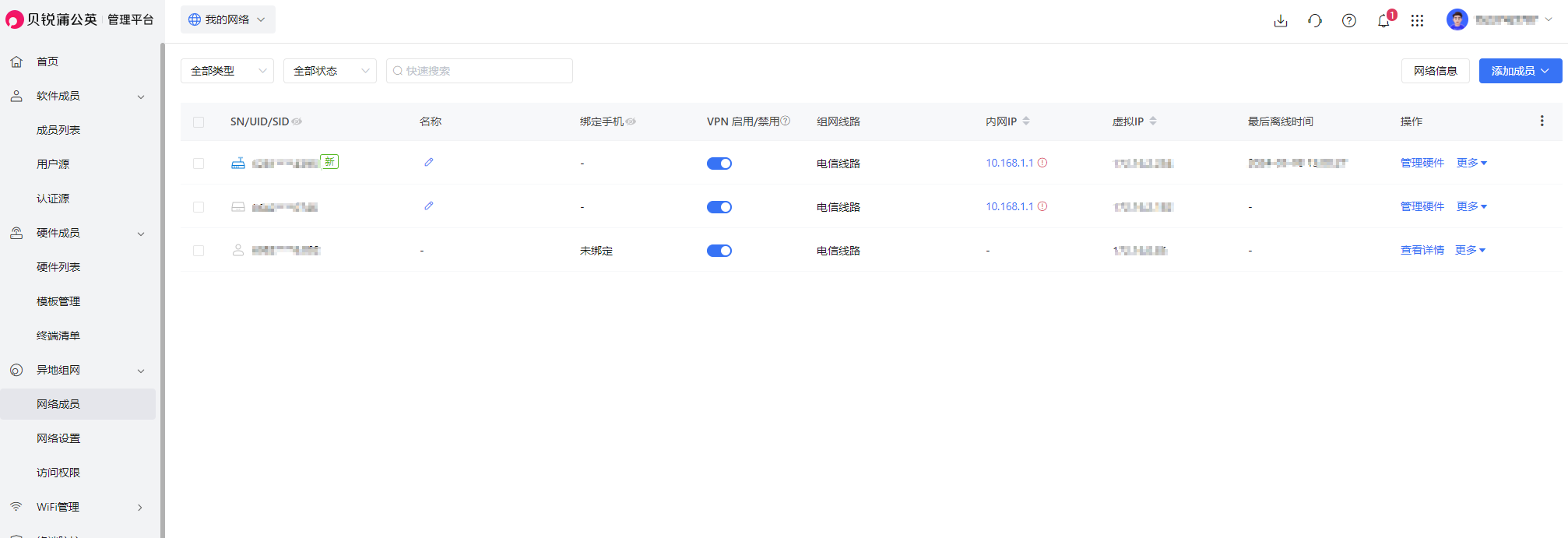 当然,为了方便管理,蒲公英还有相对应的软件服务。异地虚拟组网技术的应用可以帮助企业主和维修运营人员将散落在不同地区的设备,通过蒲公英的云端管理平台实现虚拟统一组网。