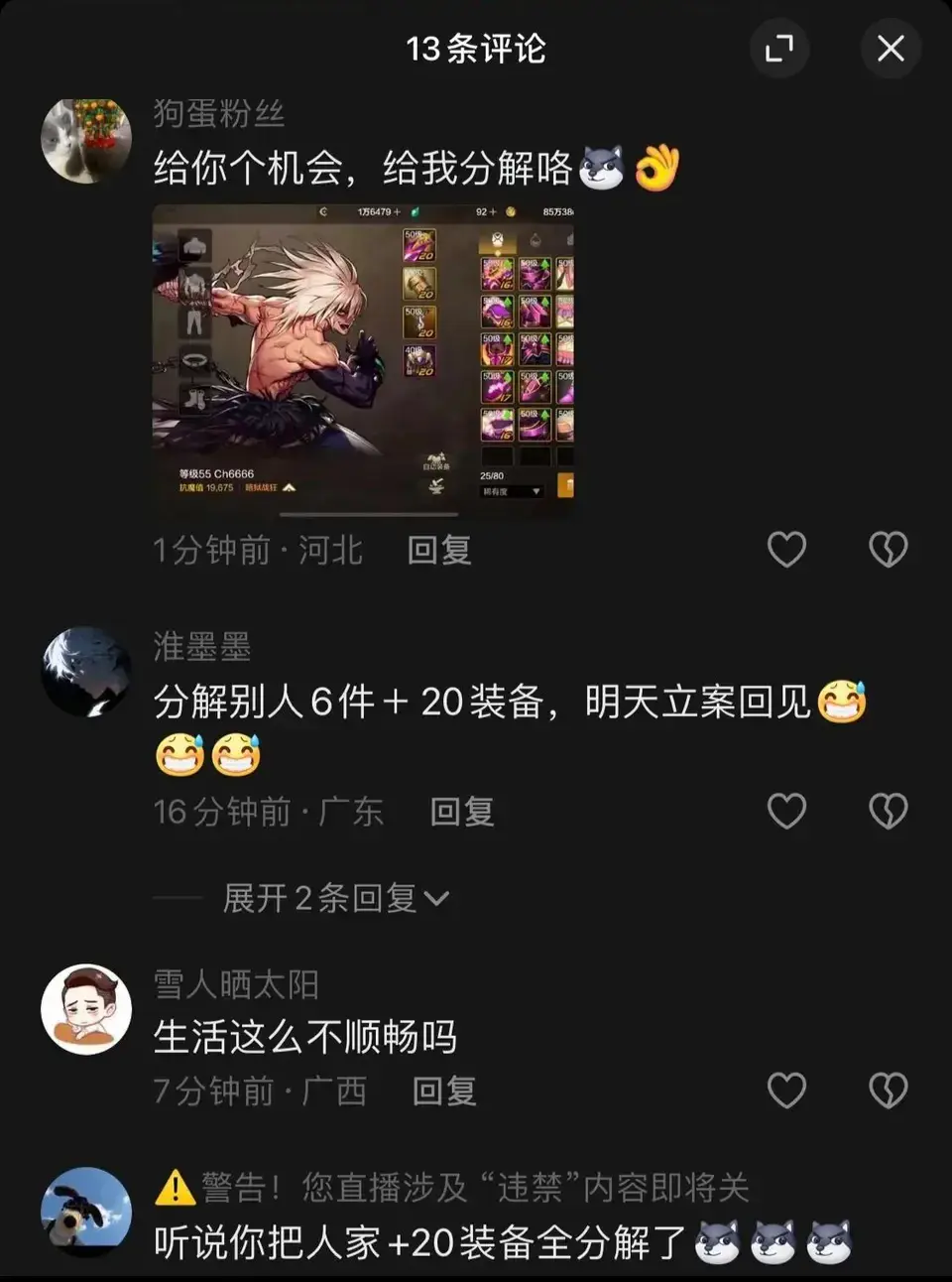 相信大家闲来无事都会看看主播打打游戏啥的,有时粉丝也会让主播上号代玩啥的,但如果作为观众也要注意不要随便捣乱,因为近日就发生了主播破防分解号主装备的事件。