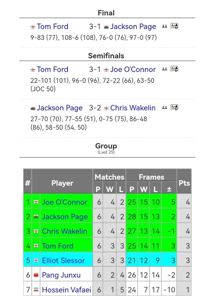 小组赛积分:奥康纳4分、佩奇4分、韦克林4分、福德3分、斯莱瑟3分、庞俊旭2分、瓦菲1分
