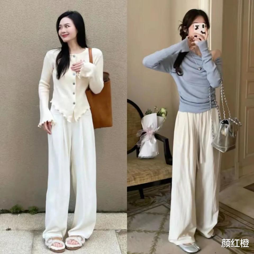 如果是小个子女生的情况下,我们可以选择上短下长的搭配方式,比如下面这一件白色的针织开衫和雾霾蓝的一字肩上衣,搭配上白色的长裤,穿出来的效果精致甜美,还有一种慵懒随性的效果,非常适合日常穿搭。