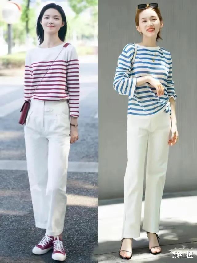 当然了,日常生活中想要穿的更时尚,更休闲的情况下还少不了那种天生就拥有时尚的条纹针织上衣来搭配上白色的长裤,脚踩一双帆布鞋或者是高跟鞋,下面这两套穿衣打扮就很适合咱们普通大众的日常穿搭。