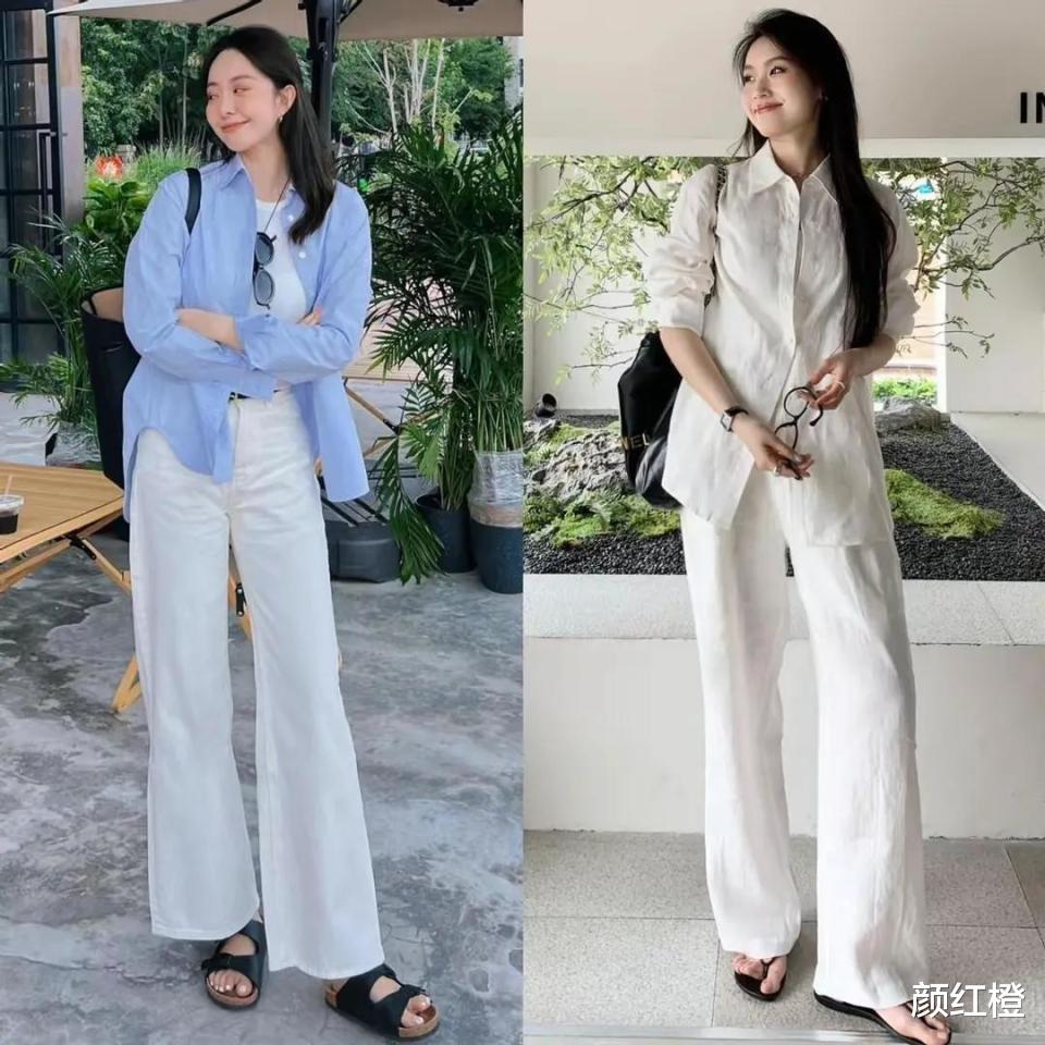 如果你喜欢穿比较个性色彩的衣服,确实选择白色的裤子最佳,例如下面用浅蓝色的衬衫或者是紫色的衬衫,分别搭配上白色的长裤,穿出来的效果很洋气,很个性,一点违和感都没有,而且30岁的女性穿在身上之后还特显年轻,特显气质。