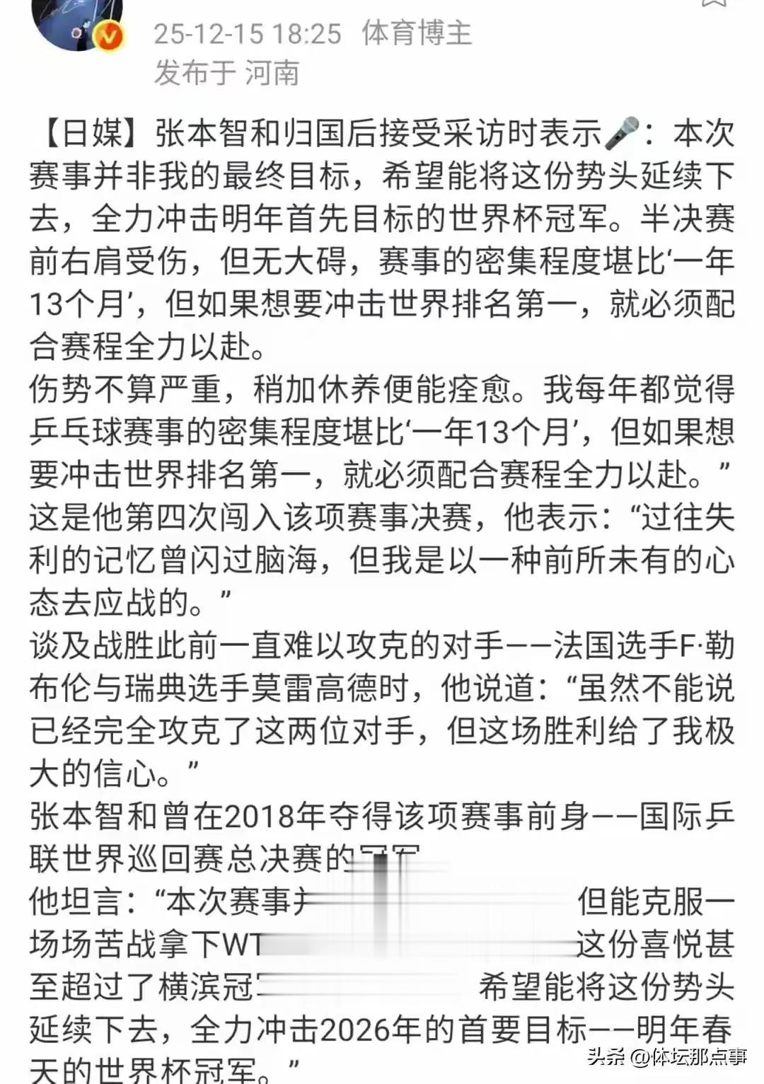 除了看淡伤病,张本智和更直言要“找回场子”,弥补全年遗憾。他坦言今年前半赛季表现拉胯,新加坡大满贯、多哈世乒赛等关键赛事屡屡掉链,要么首轮出局要么提前败北,直到年末才发力冲刺,虽最终拿下4个冠军,却仍对全年表现不满。对于此前在中国赛场的失利,他也不回避,称客场氛围和特殊器材都不是输球的理由,实力差距才是核心,接下来要针对性补强,把之前丢的荣誉一点点赢回来。