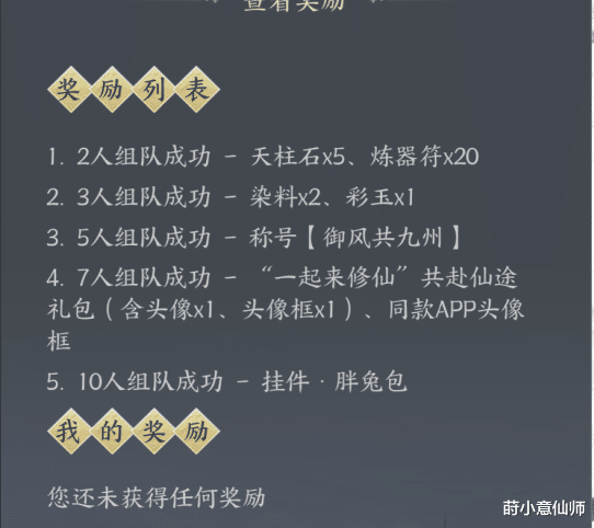 只需要识别一个二维码,然后拉上小伙伴们一起组队,当队伍人数满 10 人的时候,哇塞,一大堆好东西就等着你们来领啦。这里面有能让你在游戏中实力大增的天柱石,足足有 5 个呢,就像拥有了 5 颗神奇的魔法宝石,助力你在游戏世界里披荆斩棘;还有 20 个炼器符,这可是打造超强装备的必备神器呀,有了它们,你的装备就能变得更加厉害,让你在战斗中所向披靡;染料也有 2 个哦,就像拥有了两支神奇的画笔,可以随心所欲地给你的角色换上各种酷炫的颜色,打造属于你自己的个性造型;彩玉 1 个,这可是游戏里的珍贵玩意儿呀,说不定能给你带来意想不到的惊喜呢;还有那超拉风的称号【御风共九州】,戴上它,你就仿佛成为了游戏世界里的传奇大侠,走到哪儿都能吸引众人羡慕的目光;共赴仙途头像框也不能少呀,让你的头像瞬间变得高大上,成为游戏好友列表里最靓的仔;最最让人兴奋的是,还有绝版挂件・胖兔包哦,这可是独一无二的珍藏品呀,背着它,你就是整个游戏里最可爱、最特别的存在.