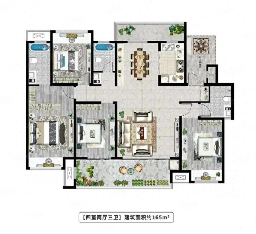 或许你见过太多的房子,但是160多平米的户型,是市场上的一种主流的概念户型。这样的房子比较低调,而且展现了轻奢的品味,这4个大的卧室应该可以满足大部分人的需求。