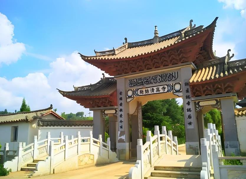 始建于雍正八年的拖姑清真寺在当地被尊奉为祖寺。它位于鲁甸那山绕水环的玉盘山上。四周,千顷良田舒展铺陈,回族村寨星罗棋布。关于这座清真寺的来历,有一个神秘的传说。往昔,驻寺阿訇为破旧不堪的清真寺无力修缮而日夜焦愁。一日夜晚,疲惫的阿訇进入梦乡,梦中,一个神秘的声音指示他用三天时间备好修缮材料,其余的无需操心。阿訇依言照办。奇迹就在第四天清晨发生了,当人们晨起进行晨礼时,一座气势恢宏、庄严肃穆的清真寺已赫然矗立在眼前,仿佛是一夜之间“飞”来的。
