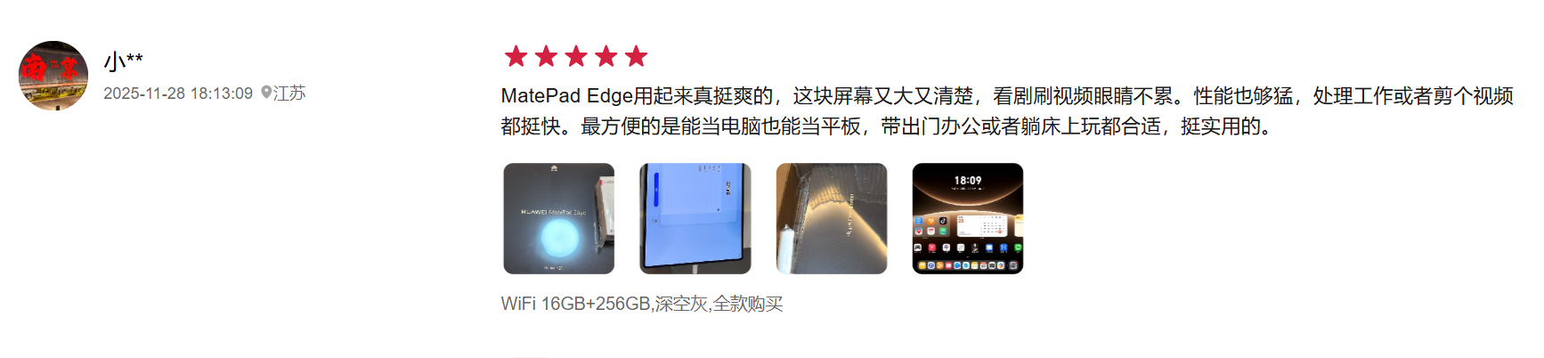 有用户表示,“华为MatePad Edge用起来真挺爽的,这块屏幕又大又清楚,看剧刷视频眼睛不累。性能也够猛,处理工作或者剪个视频都挺快。最方便的是能当电脑也能当平板,带出门办公或者躺床上玩都合适,挺实用的。”
