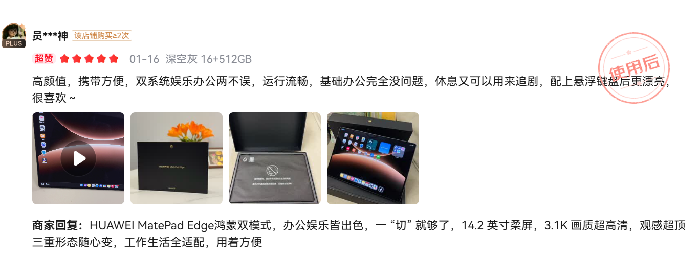 自上市以来,华为MatePad Edge凭借其创新形态与卓越体验获得了广泛用户认可。