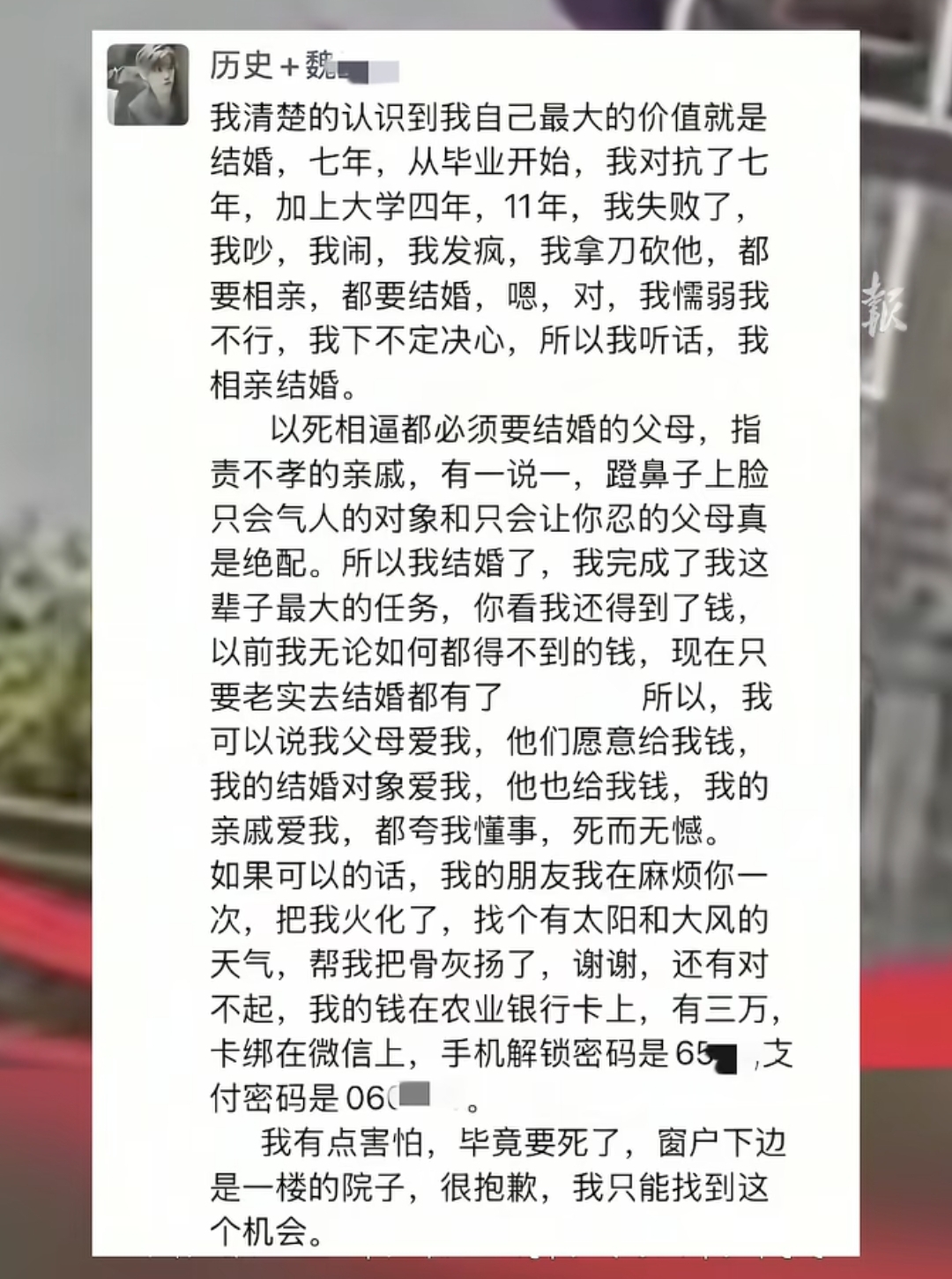婆家购置的婚房,是中高档小区,坠楼前最后几分钟,她发了朋友圈,遗言字字泣血,句句透露绝望,她说自己不想结婚,讲述了 被催婚的十一年,她认为自己最大 价值,就是结婚,后事都交代给朋友,而非父 母,可见她内心多 绝望,但凡 原生家庭,给她一点点爱,她也不会走上绝路。