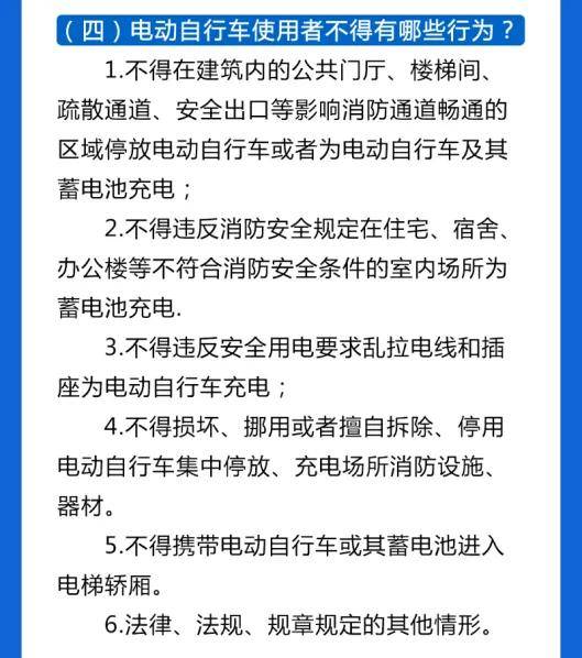 规定包括:禁止携带电动自行车或其蓄电池进入电梯轿厢,禁止非法改装电动自行车及其配件,以及实施电动自行车和蓄电池的赋码销售和登记制度,以实现全生命周期管理。同时,鼓励和支持建设电动自行车集中停放和充电场所,并明确禁止在建筑内影响消防通道畅通的区域停放或充电,以及乱拉电线和插座充电等不安全行为。