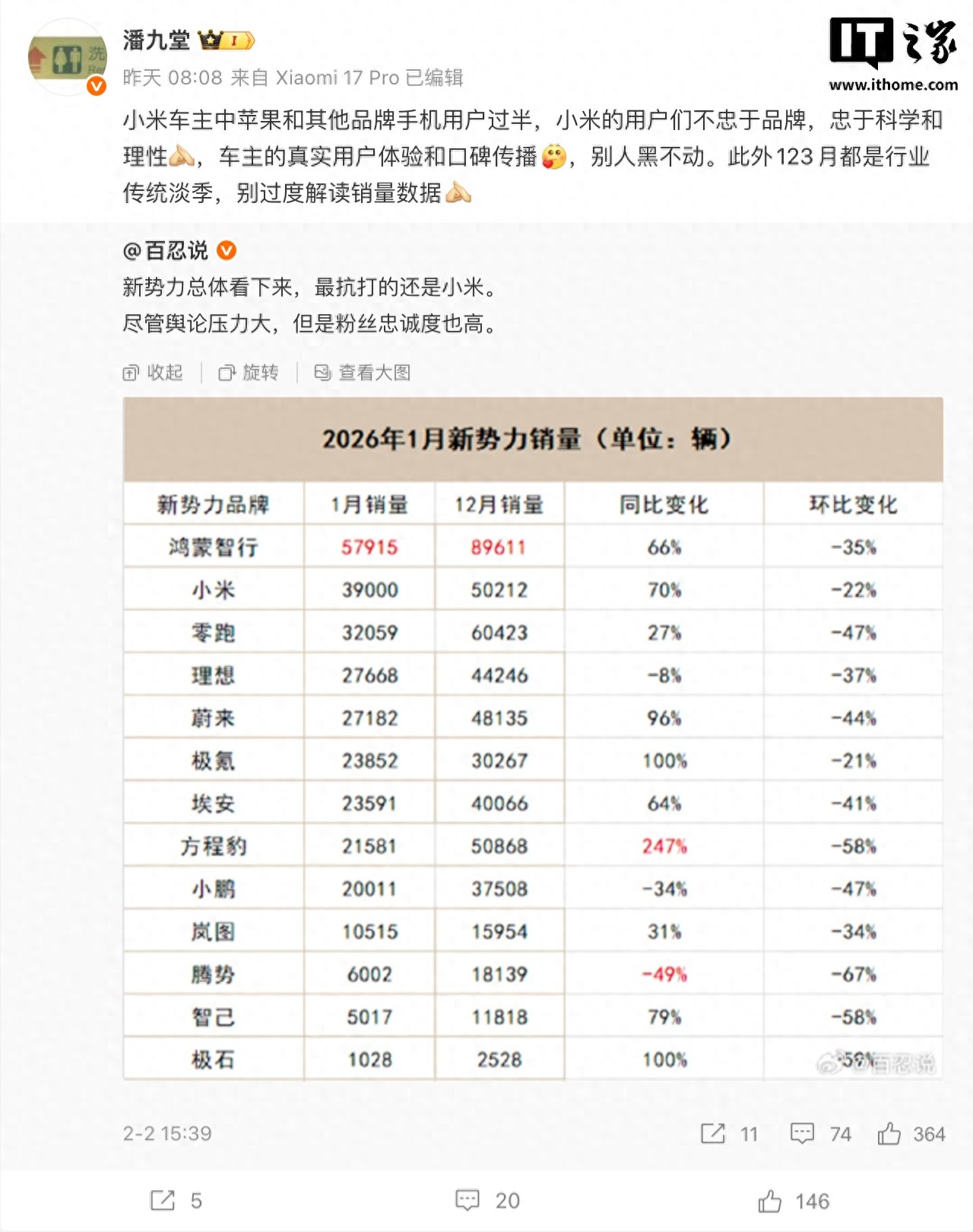 2 月 4 日消息,2 月 3 日上午,小米产业投资部合伙人潘九堂发文称:“小米车主中苹果和其他品牌手机用户过半,小米的用户们不忠于品牌,忠于科学和理性。车主的真实用户体验和口碑传播,别人黑不动。此外,1、2、3 月都是行业传统淡季,别过度解读销量数据”。