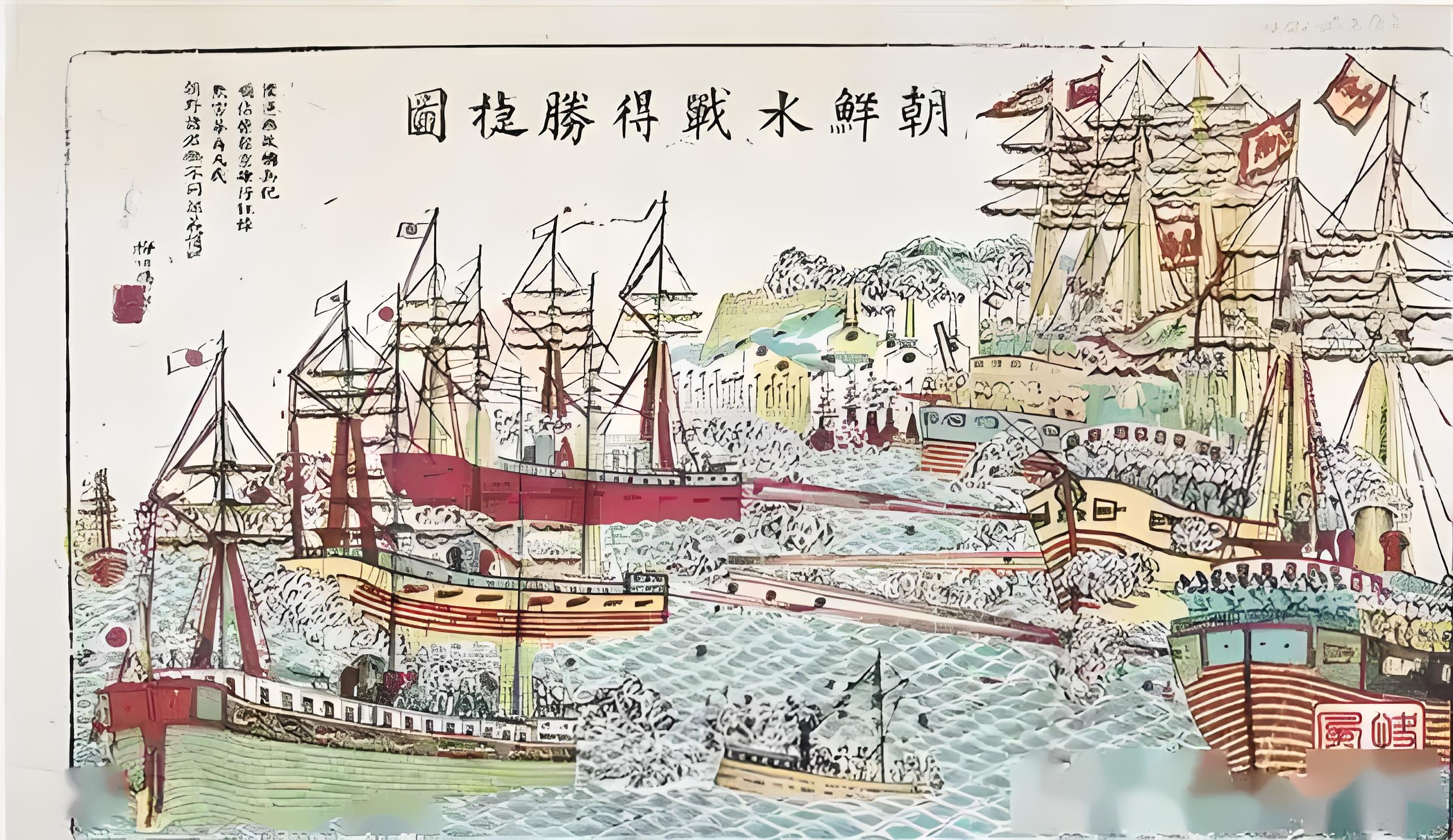 在1894年9月,上海《点石斋画报》画师团队主导绘制的《朝鲜水战得胜捷图》中,·清军战船排成“一字长蛇阵”,炮火连天,日军舰船被炸成碎片,士兵纷纷跳海。实则此战清军仅有3艘木壳旧船迎战日军新式巡洋舰,未发一炮便仓皇撤退。画中还虚构“日军投降”:版画角落特意描绘一名日本军官跪地献刀,旁书“倭酋乞降”,而真实战报记载日军仅轻伤2人,清军却沉没2船、死伤70余人。
