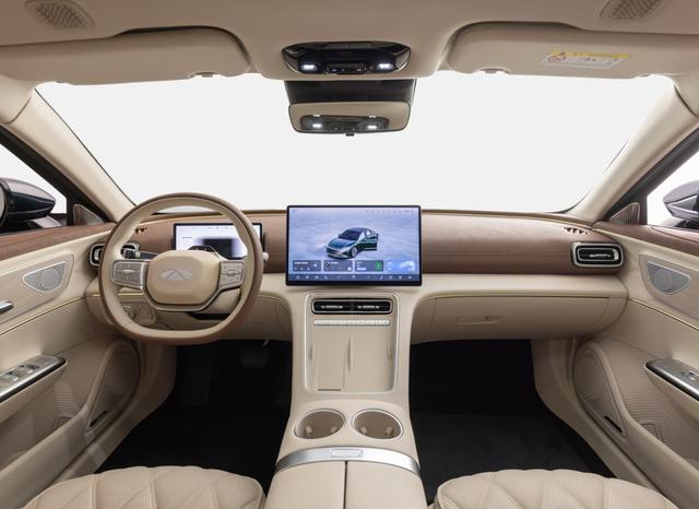 内饰方面,风云A9L中控台配备了悬浮式仪表盘+中控屏,其中中控屏的尺寸达到了15.6英寸,车机内置高通骁龙8255芯片(非8295芯片),将匹配灵犀智舱2.0系统。在中控屏下方是长条形的空调出风口,出风口下方有一排物理按键,为用户带来更便捷的操作体验,方向盘采用了全新样式的双幅式设计。
