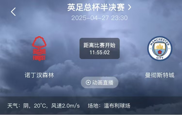 今晚23:30,足总杯半决赛将迎来一场焦点大战,诺丁汉森林坐镇主场迎战曼城。这场比赛不仅是两支球队之间的较量,更是关乎着晋级决赛的关键战役,究竟谁能突出重围,让我们拭目以待!