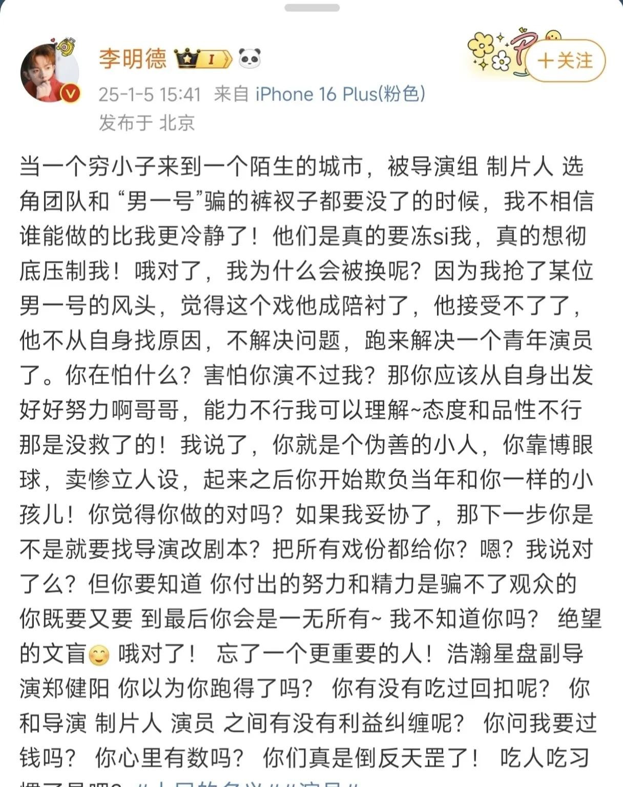 李明德这出,可谓是“猛料”频出。他和马天宇、和颂传媒之间的冲突,可以说是把娱乐圈的“潜规则”撕开了一道口子。他公开指控,爆出猛料,勇气可嘉。但他这种方式,是不是有点太冲动? 会不会伤敌一千,自损八百呢? 年轻演员在面对强权时,该如何更好地保护自己,又能避免玉石俱焚? 这值得我们深思。事件也反映出娱乐圈权力分配的不平衡,以及年轻艺人维权的困境。