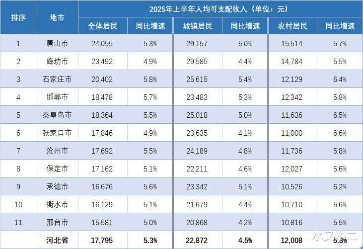 2025年上半年人均可支配收入超过两万的还有石家庄市,收入金额为20402元。与唐山和廊坊相比,石家庄市人均收入相对较低,但其同比表现却显著好于前面两城,增速达到了5.8%,实为全省最高,也因此得以一举跨过两万元门槛,表现可圈可点,未来大有可期!