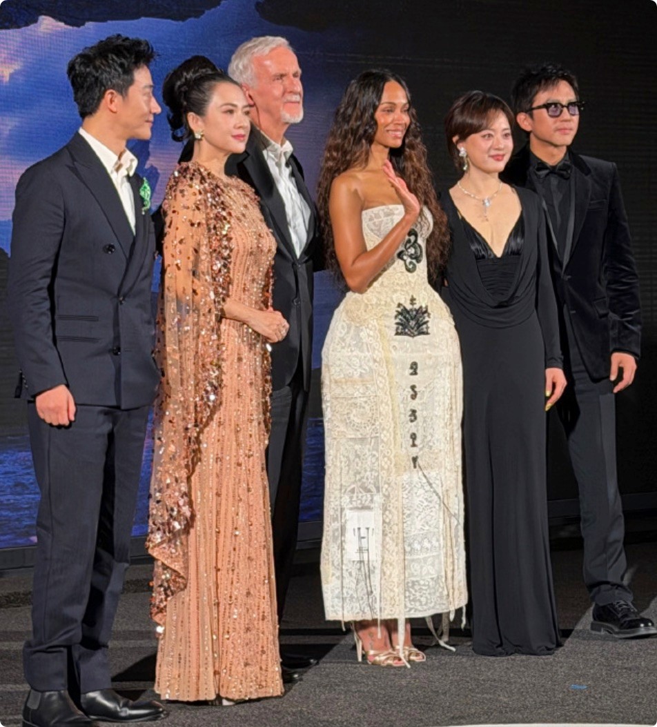 当天的登台顺序依次是邓超、孙俪,接着是黄轩,最后才是章子怡,而她之后便是导演卡梅隆和女主演佐伊·索尔达娜。