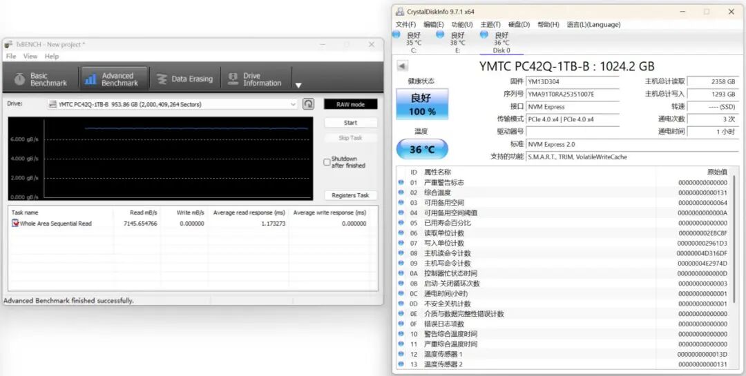 ▲长江存储PC42Q商用消费级固态硬盘1TB的全盘平均顺序读取速度高达7145.65MB/s,工作温度仅36℃。