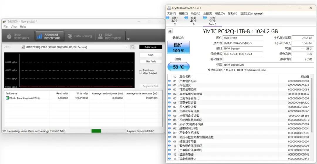 ▲连续写入251GB左右的数据后,长江存储PC42Q商用消费级固态硬盘1TB的温度只有53℃。