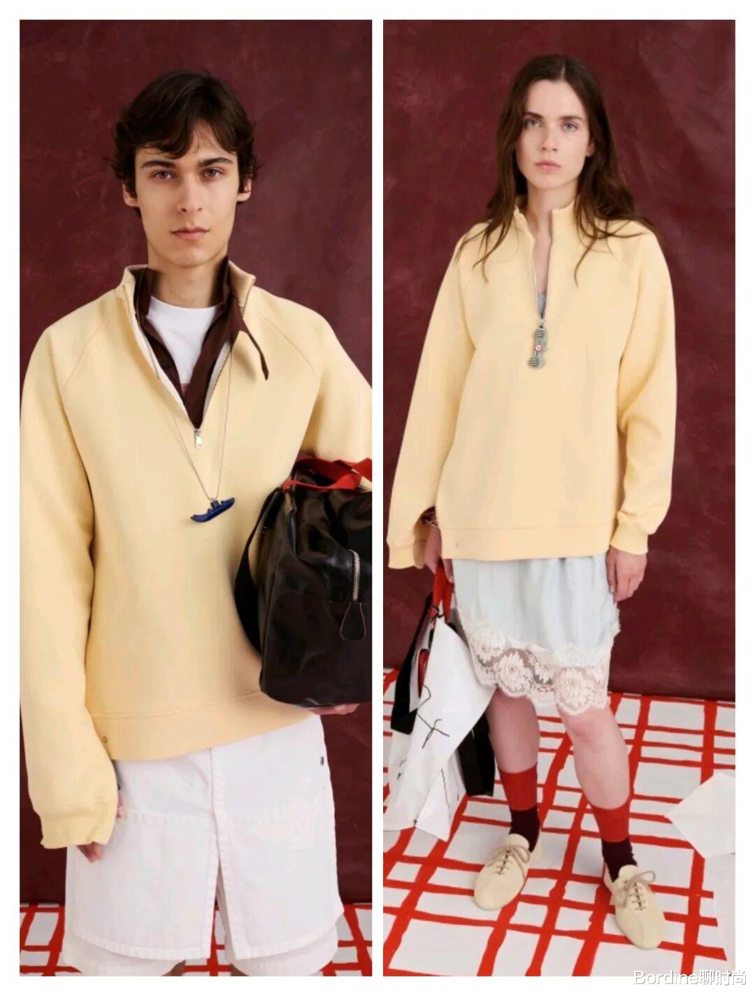 这些柔和的黄色颜色在色彩的鲜艳中也多了几分粉蜡色调的温柔感,以色彩增加了一些温暖的能量感,和针织面料的结合还多了一些材质的纹理质感,而插肩袖子等设计的出现,修饰了肩部线条,也带着一些随性的休闲感。在搭配中,浅色的下装在视觉的对比中,撞色的视觉刺激也增加了一些清新的时尚。