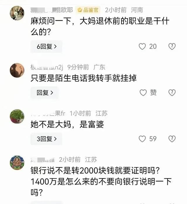 很多网友都留言说自己再少一个领一辈子也赚不了这么多的钱,竟然这位大妈目前已经拥有了1,400万,简直是不可思议,都在质疑他的钱是怎么来的?似乎大妈被骗的过程不是重点,而关注的大妈1,400万才是重点。