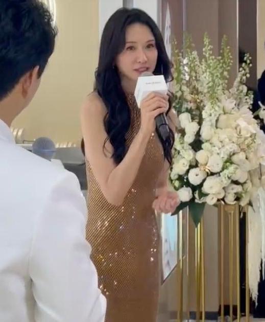 她穿的金色亮片连衣裙,礼服款式很修身,很好的展现出她高挑的身材。