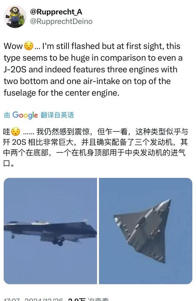 看看这个国外网友怎么说的:中国该新型战机确实配备了三个发动机,两个在底部,一个在机身顶部用于中央发动机的进气口。