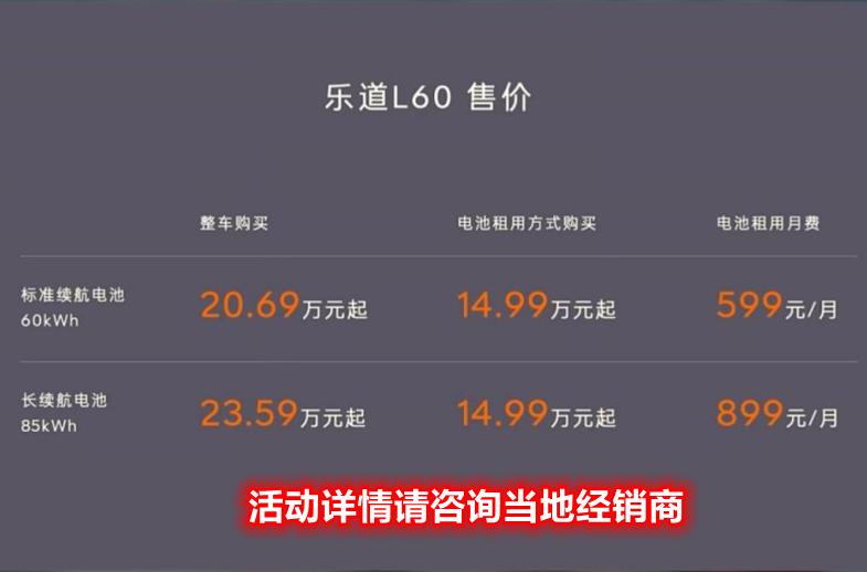 当然,如果是现在入手乐道L60,消费者还可以享受到诸多福利和权益,比如它的价格门槛为20.69万元,但如果选择BaaS租电模式,也就是“车电分离”购车方案,撇开电池不算,只需要14.99万元,外加每个月599元的电池租赁费,就可以轻松开回家。