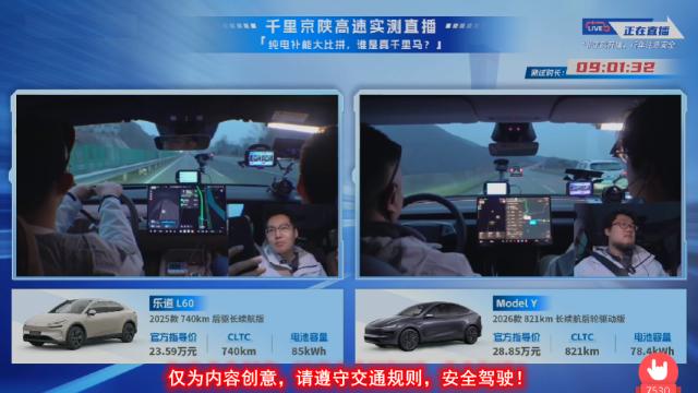 在此次的京陕高速千里直播中,参与实测的特斯拉Model y车型,为售价28.85万元的2026款长续航后轮驱动版,搭载78.4kWh的电池组,CLTC续航为821km,0-100km提速时间为5.6秒。而乐道L60则是售价23.59万元的2025款后驱长续航版,搭载85kWh的电池组,CLTC续航里程为740km,0-100km提速时间为5.9秒。
