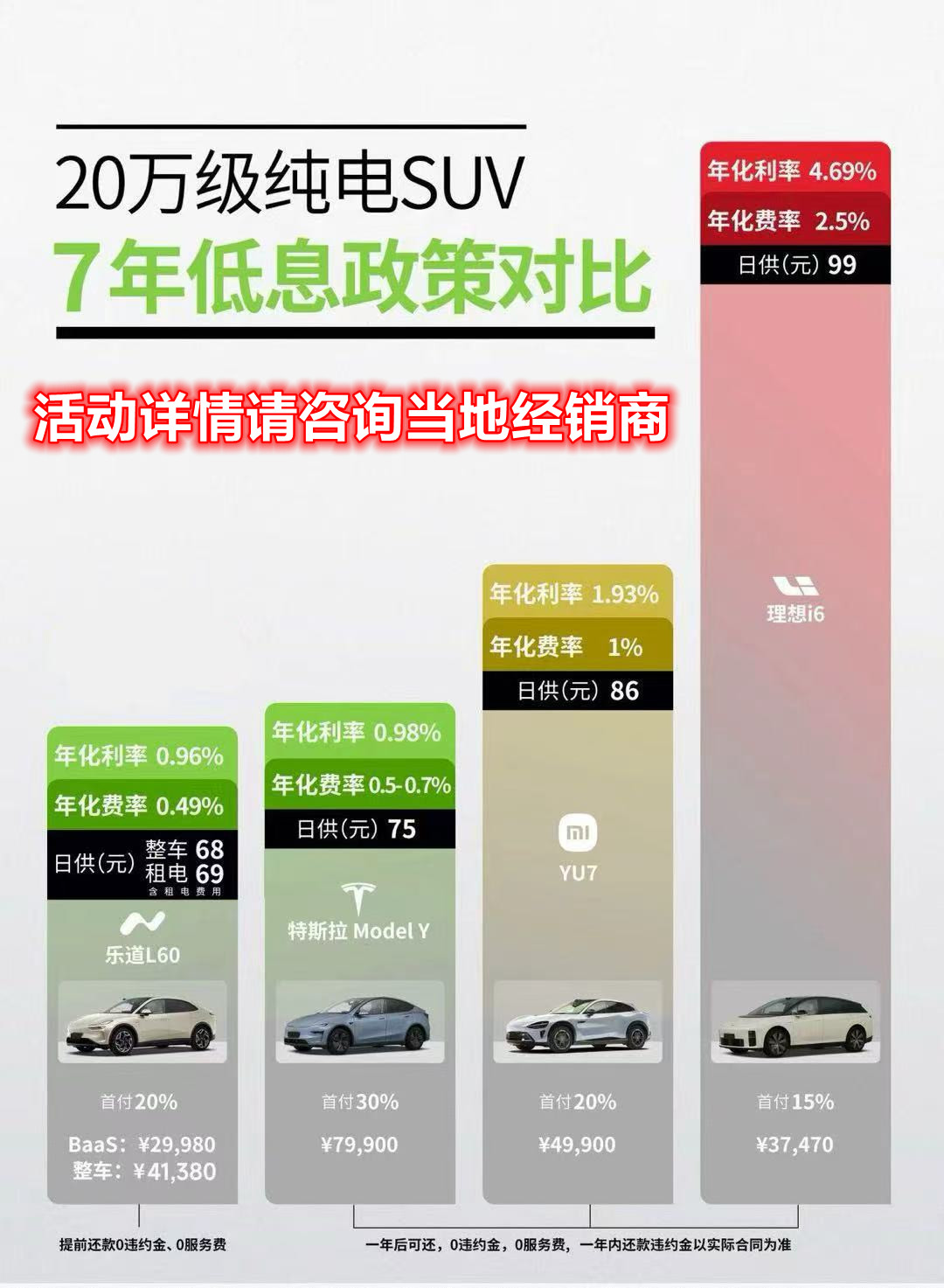 同时,它还有7年低息政策,年化费率低至0.49%,首付仅需20%起,如果购买整车,首付为41380元起,日供低至68元。如果选择BaaS电租方案,首付更是低至29980元起,日供也不过69元(含租电费用)。同时,如果是提前还款,可享受0违约金、0服务费。而对于同级的特斯拉Model y,它的首付则需要30%,首付金额79900元起,并且日供需要75元。所以,整体的差距还是显而易见的。