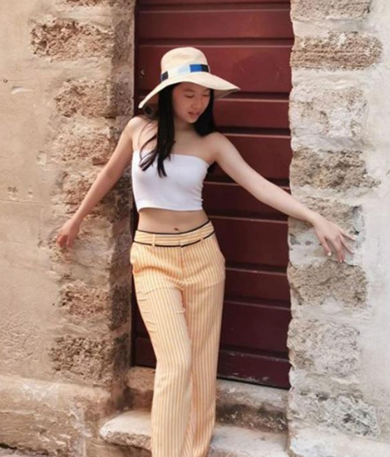 白色抹胸上衣,夏日的热情与青春的轻盈在她身上得以释放。配上浅黄色条纹阔腿裤,休闲中透着随性而优雅的味道,仿佛带着她走向了一个悠闲的假期。卡其色草帽搭配,不仅是防晒的必需品,更添了几分旅人的心情与风情。在这份悠然中,她展示了不同于走秀的时尚感,更多的是一种生活的态度和对美好生活的向往。