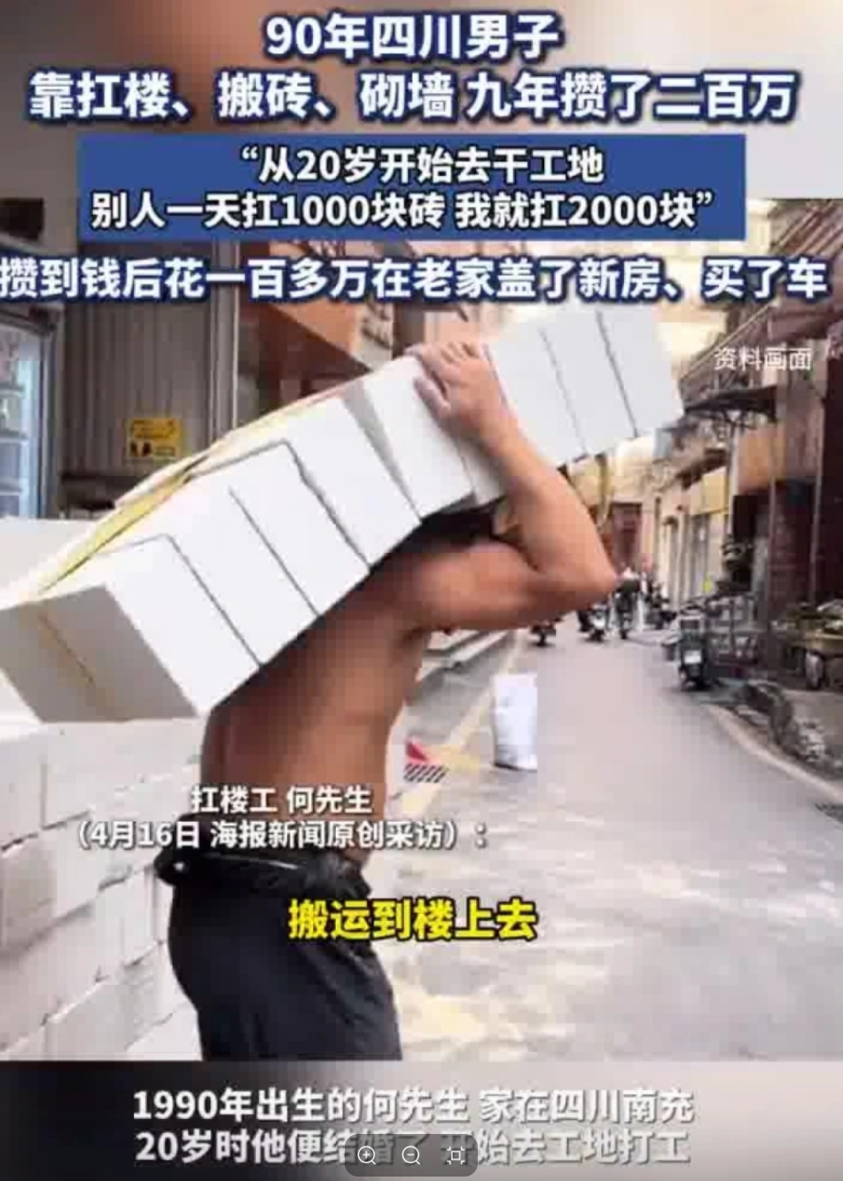 正午的太阳毒得很。何友平蹲在阴凉处啃馒头,手机相册里存着老家新房子的照片:三层小楼贴着白瓷砖,院里的枇杷树刚结青果。这是他用九年间扛过的两千三百万块砖换来的——平均每块砖挣八分钱。