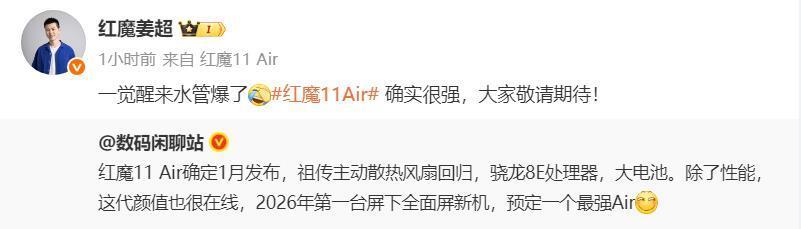 日前,数码博主“数码闲聊站”爆料称,“红魔11 Air确定1月发布,祖传主动散热风扇回归,骁龙8E处理器,大电池。除了性能,这代颜值也很在线,2026年第一台屏下全面屏新机,预定一个最强Air”。而让大多数网友没想到的是,这条爆料竟然得到了 @红魔姜超 的转发,并且其还配上了“一觉醒来水管爆了 #红魔11Air# 确实很强,大家敬请期待!”的评论,由此来看,该机将在明年1月发布基本是确定的了。