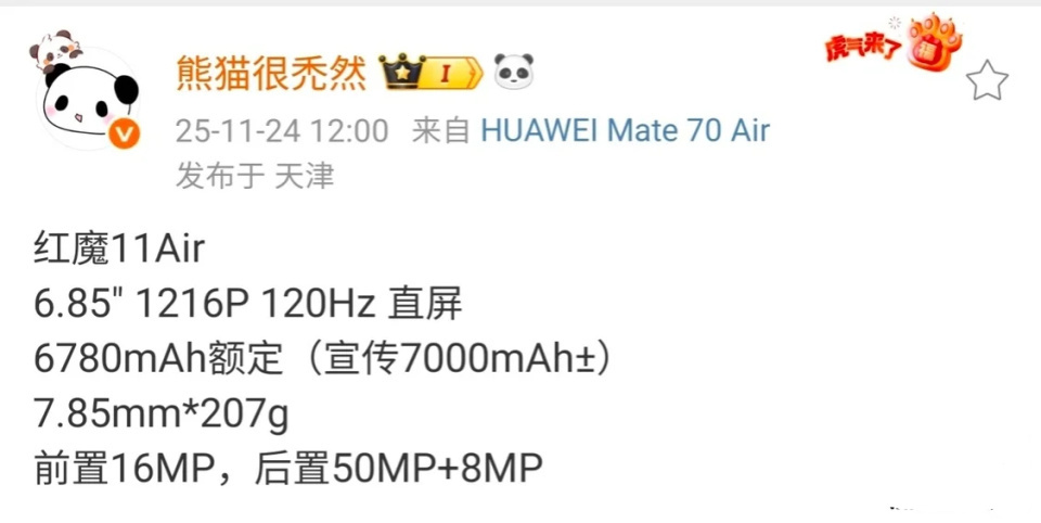 此外,今年11月,数码博主“熊猫很禿然”就曾曝光过疑似该机的部分核心配置,据其称,红魔11 Air新机将采用1216P分辨率的6.85英寸直屏,支持120Hz高刷,内置额定容量6780mAh电池(可以宣传为7000mAh±),该机厚7.85mm,重大概207g,后置5000万像素+800万像素双摄组合,前置1600万像素自拍镜头。