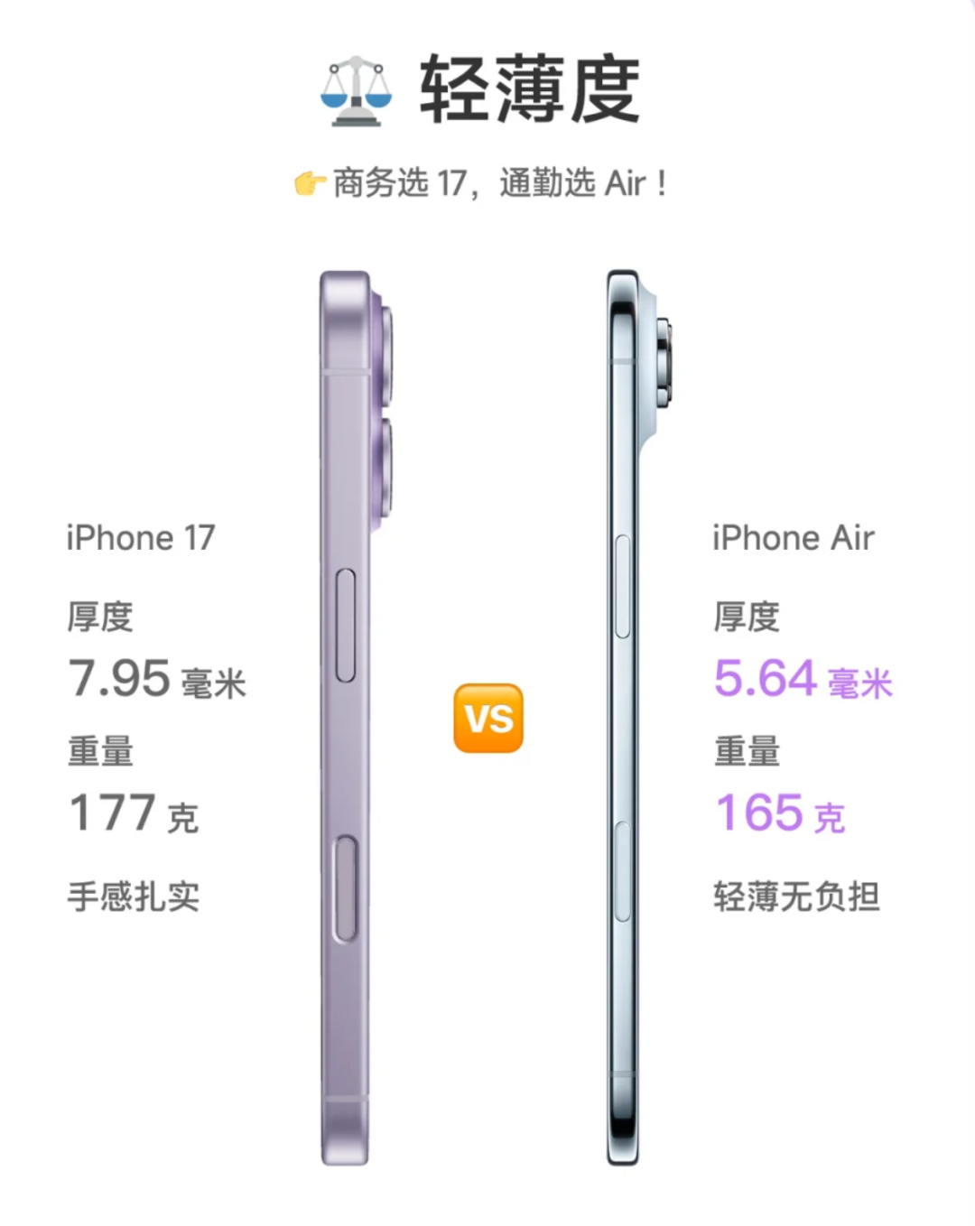iPhone Air的优势:毕竟是8000价位段的手机,独享钛金属边框,并且极致轻薄5.64毫米厚度+165克的重量。性能上也看齐Pro系列用上A19Pro(少一个GPU核心)和12G运存,6.5英寸的屏幕也更适中。但是Air的短板也很明显,单摄+单扬声器使得这手机的实用性没那么强,由于轻薄了一些,电池容量比iPhone17还小一丢丢。另外eSIM在国内还有点水土不服,这也是一个不小的槽点。