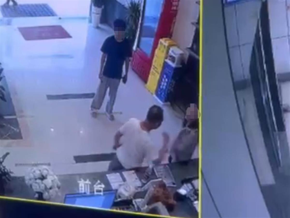 监控视频还显示,几分钟后,曹女士拨打报警电话后又走到前台,白衣男子又走到她身边,用右手击打她的头部,并持续追击。