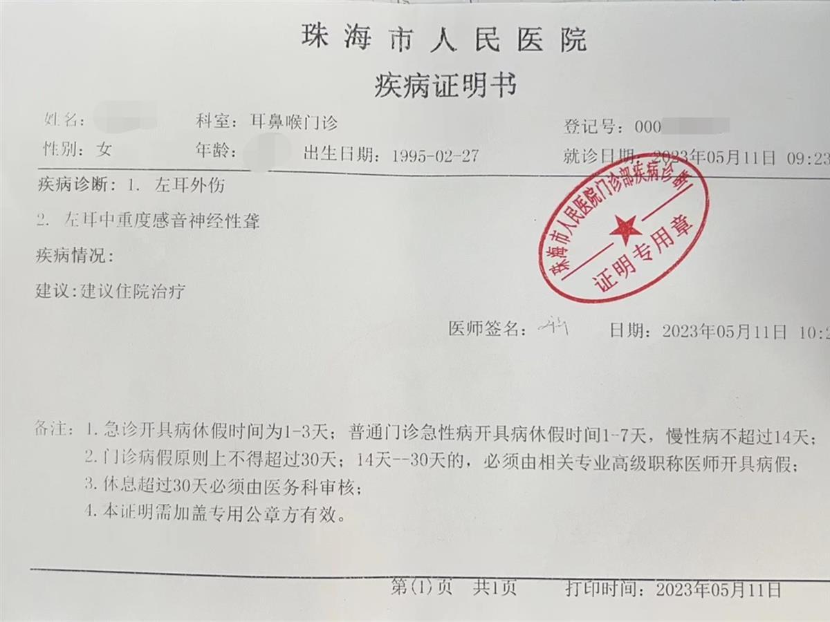 她提供的珠海市人民医院5月11日的疾病证明书上显示为左耳外伤、左耳中重度感音神经性聋,建议住院治疗。