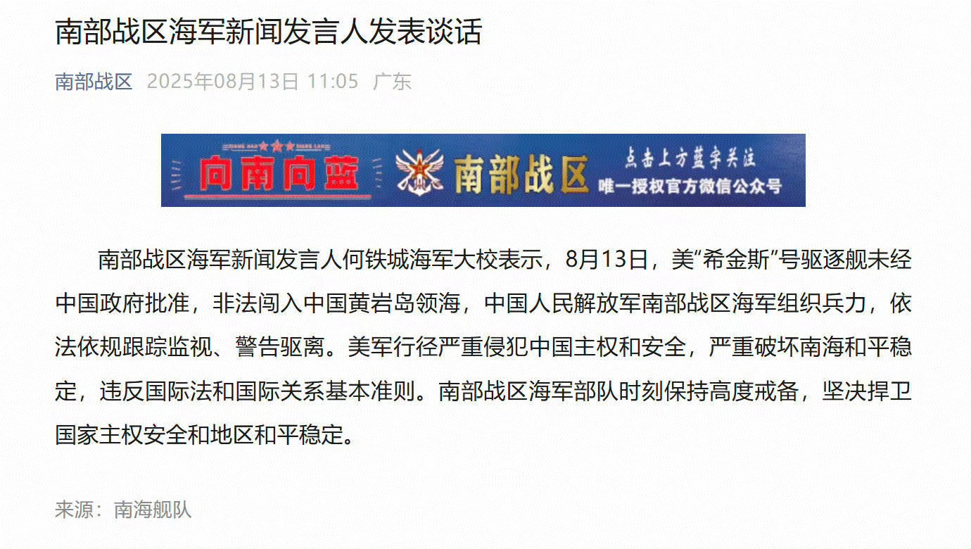 菲律宾刚闹腾完,美国人又开着军舰过来疯狂试探。8月13日,美国"希金斯"号驱逐舰未经中国政府批准,非法闯入中国黄岩岛领海,最后被中国海军监视驱离。按照我个人浅薄的看法,既然已经是领海,完全可以按照之前对待日本人的方式执行,开炮警告,不信美国人看到开炮了还敢闯进领海。