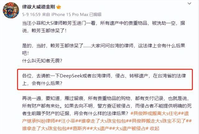 有自称自己懂法的网友,在直播间对网友进行了科普,称汪小菲根本没有权利去大S的房子里去清点遗产,因为他不是遗产继承人。