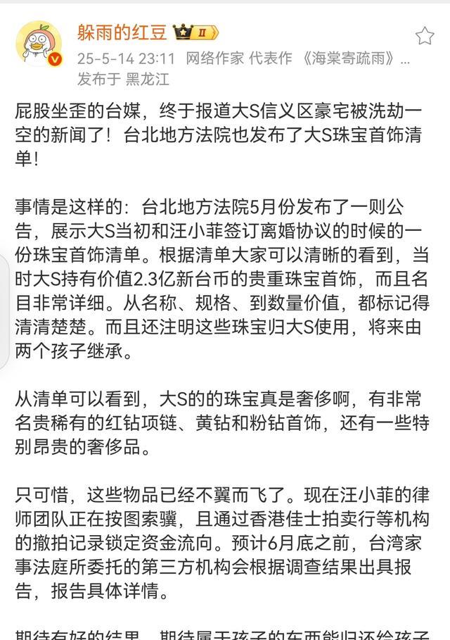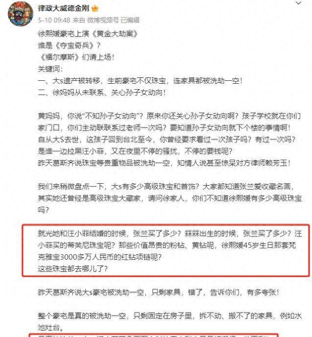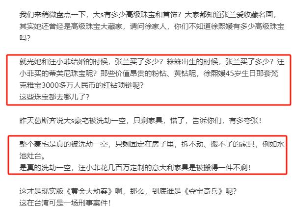 最近大S遗产失踪的事儿越闹越凶,据台湾娱记葛斯齐爆料,大S信义豪宅里的珠宝首饰、贵重物品甚至高档定制家具全都不翼而飞。