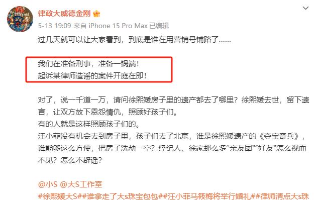 张兰律师放出消息,称他们正在准备刑事诉讼,准备一锅端,把转移遗产和造谣汪家的律师网友全部起诉。