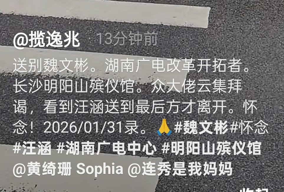 2026年1月31日,“电视湘军”缔造者魏文彬的追悼会在长沙明阳山殡仪馆举行。