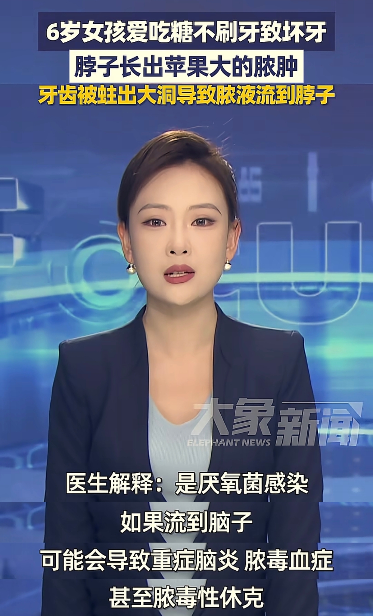 原来是跟孩子爱吃糖又不爱刷牙有关系,孩子因为不爱刷牙又爱吃糖,导致牙齿长了很多的龋齿,这些龋齿很容易催生厌氧菌,而厌氧菌感染之后就会随着血液循环到了孩子的脖子,医生还提醒:如果是这个厌氧菌到了孩子的脑子,还可能会引起重症脑炎以及脓毒血症……